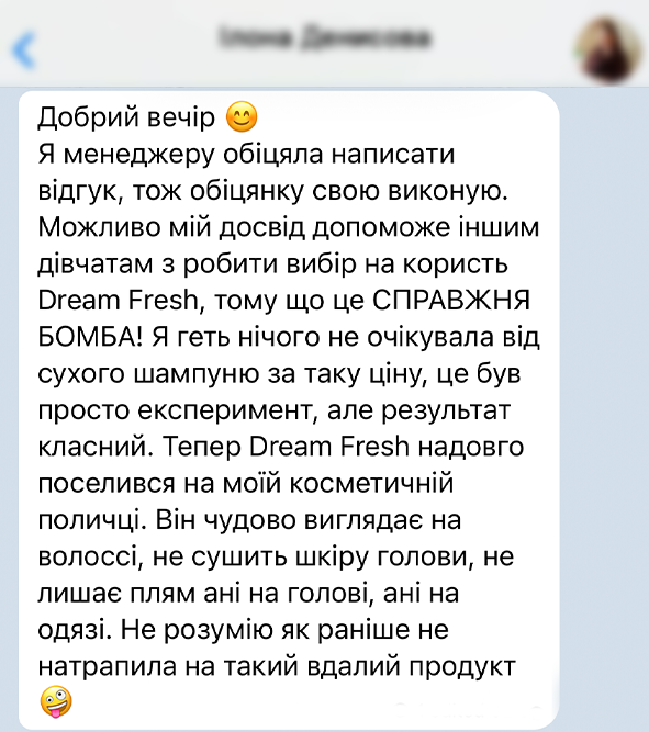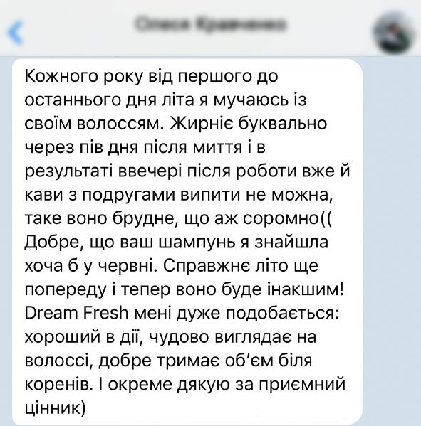 Цей продукт є справжньою знахідкою для тих, хто шукає ефективний і зручний спосіб підтримувати чистоту волосся без зайвих зусиль. Одна з переваг, за яку я особливо ціную його, це, звісно ж, натуральний склад. 'Dream Fresh' містить лише безпечні інгредієнти, які не тільки очищають волосся, але й не забивають пори шкіри голови навіть при регулярному використанні. Цей засіб поглинає надлишок жиру, не сушить волосся і не залишає білих розводів. І найголовніше, саме “Dream Fresh” дерматологічно протестований та схвалений Європейською асоціацією трихологів.