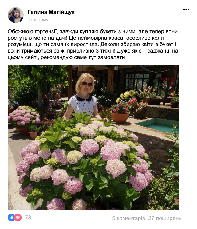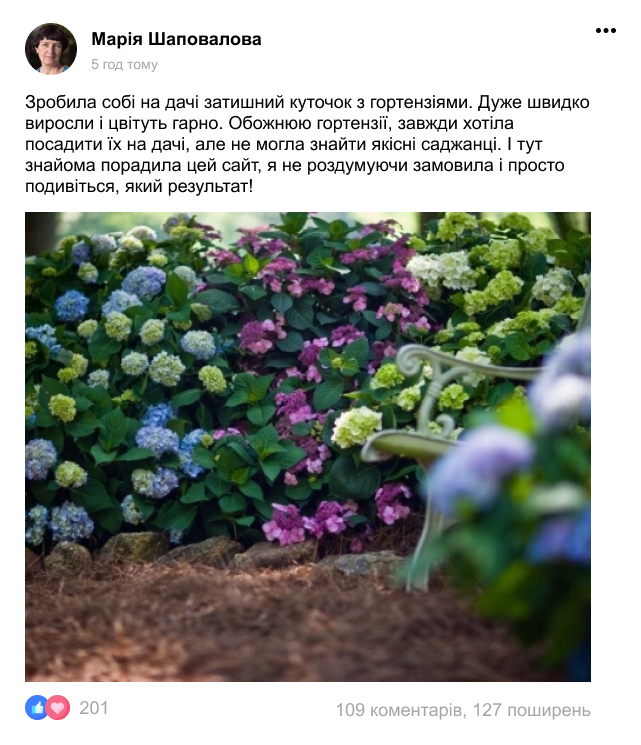 Швидкий результат та довголіття (за 1,5-2 місяці після висадки та протягом 9 років ви зможете насолоджуватись красою гортензій)