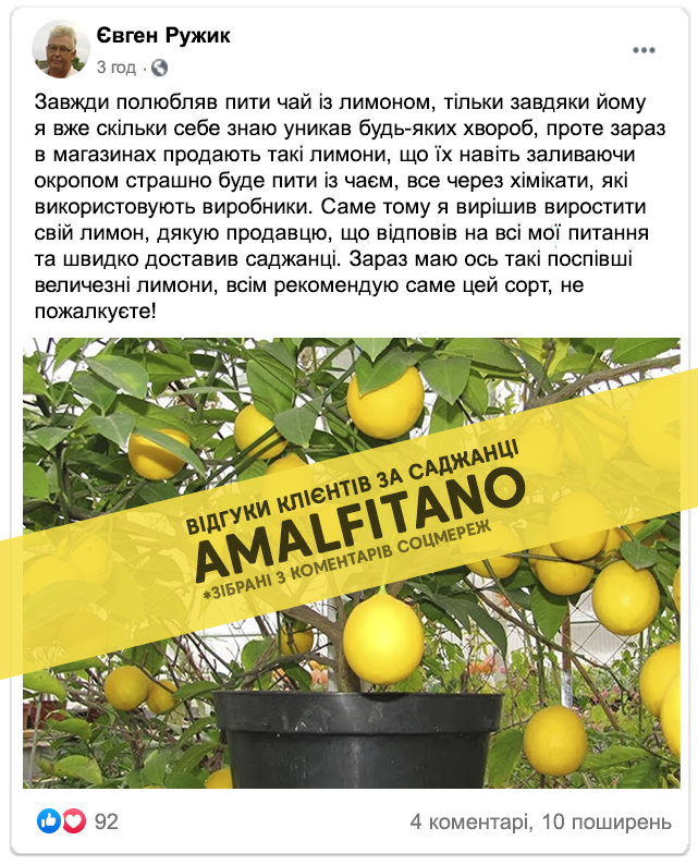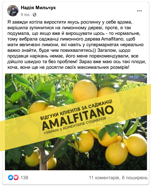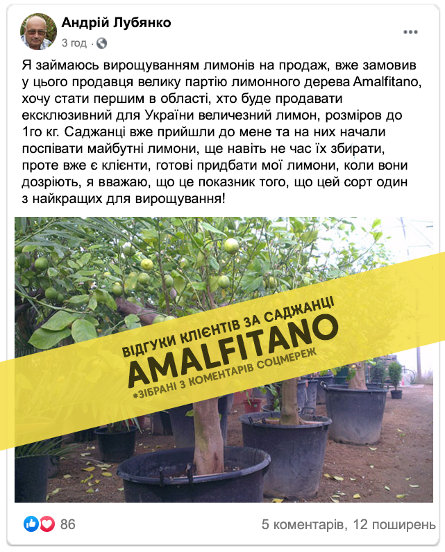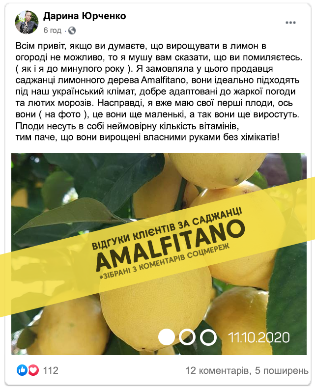 Лимонне дерево Amalfitano - одне з найбільш культивованих фруктових дерев в помірних регіонах світу. Фрукт, можна вживати безпосередньо у свіжому вигляді, широко використовується для ароматизації різних страв. Крім того, ця рослина, яка з часом і за рахунок невеликого обрізання, може дати саду хорошу тінь, є справді цікавим перспективним варіантом для вирощування на українських землях. Також можна вирощувати і в домашніх умовах завдяки не високому росту. Ми витратили більше двох років на адаптацію сорту до нашого клімату. Нам знадобилось близько 6 невдалих спроб, щоб вивести дійсно морозостійкий високоврожайний сорт, плоди якого вражають розмірами!