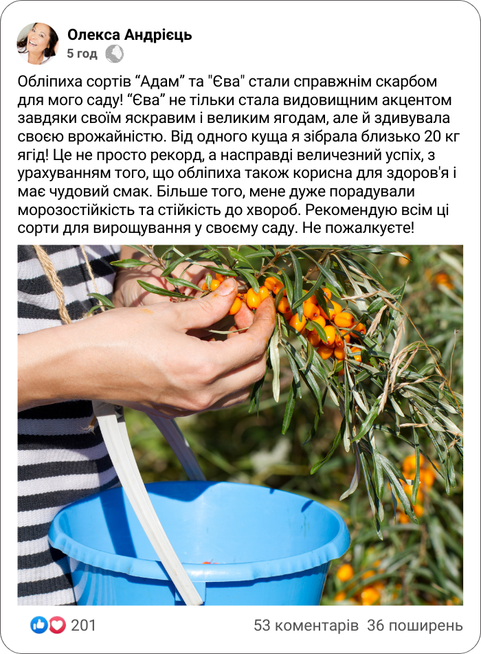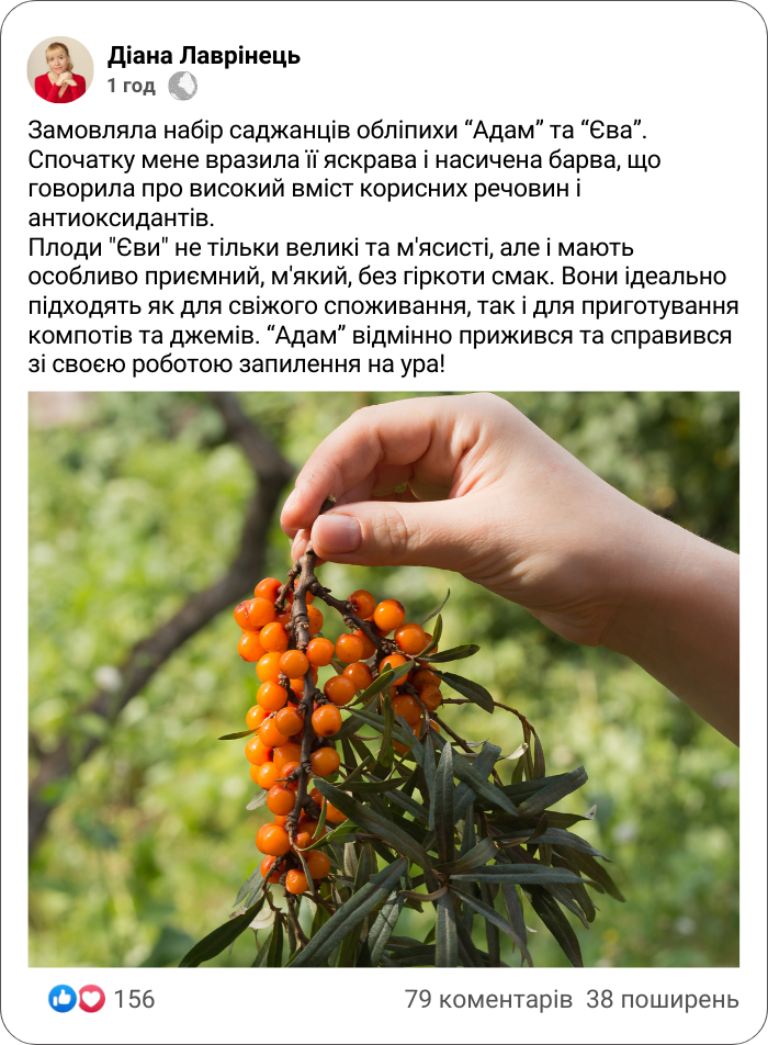"Адам" та "Єва" - обліпиха, що вродить велику ягоду, та порадує щедрим врожаєм