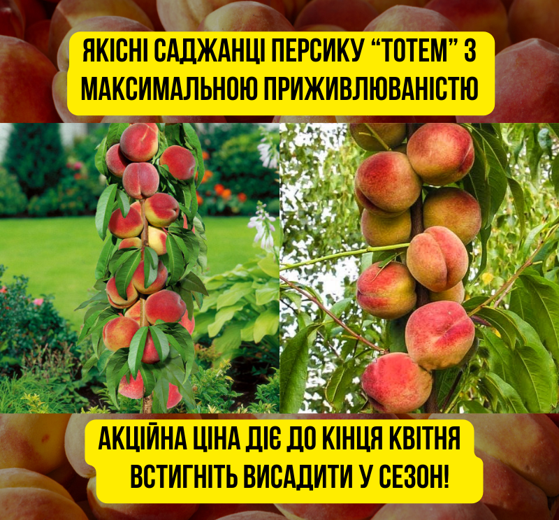 Колоновидний персик (карликовий) "Тотем" персик з дуже притупленою силою росту, цінується за компактність та декоративний вигляд. Цей сорт можна вирощувати в контейнерах або вазонах.
