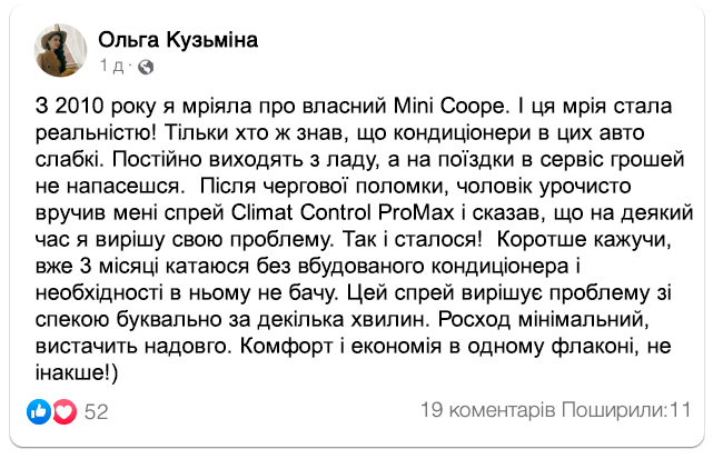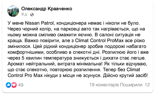 Простота використання рідкого спрею-кондиціонера Climat Control ProMax додає додаткового комфорту водію.