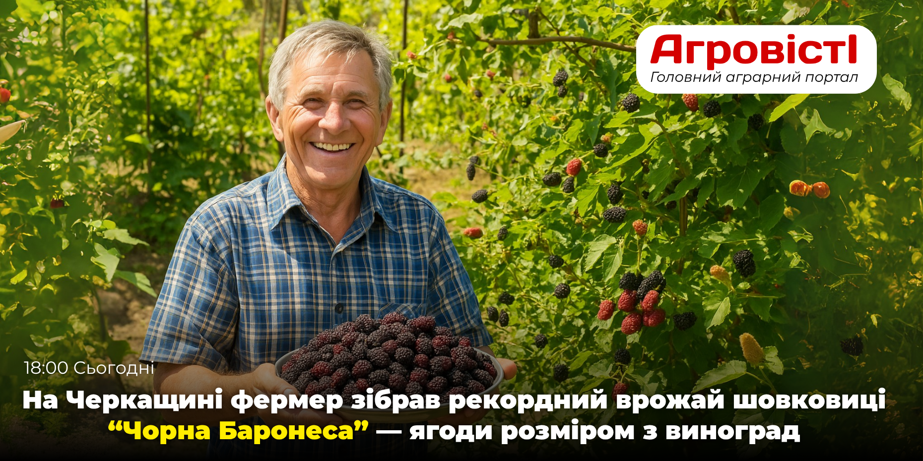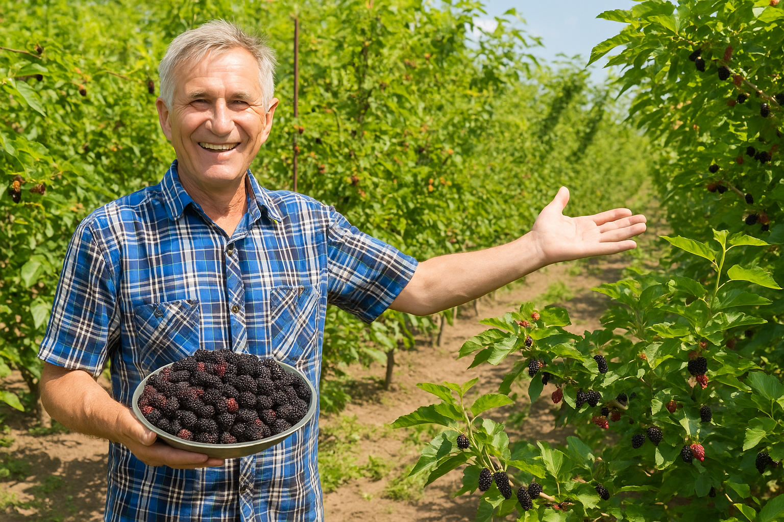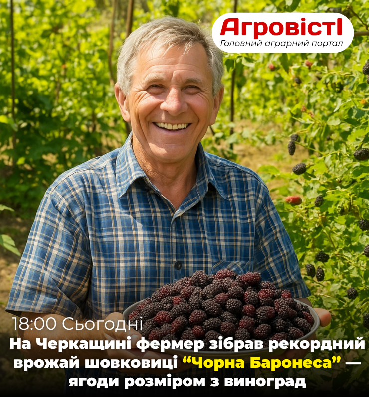 Черкаська область, 11 серпня 2025 року — Фермер із Черкащини Микола Гончар зібрав рекордний урожай шовковиці сорту “Чорна Баронеса”, отримавши понад 35 кг ягід з одного дерева. Плоди вражають розміром — до 4,5 см у довжину, насиченим темно-фіолетовим кольором та медовим смаком з легкою кислинкою.